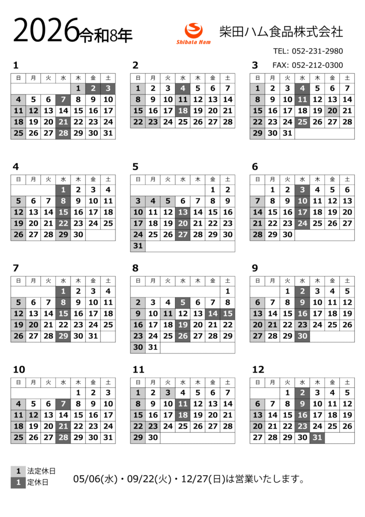 弊社における2026年(令和8年)の営業日カレンダーが確定いたしましたので、下記の通りお知らせいたします。